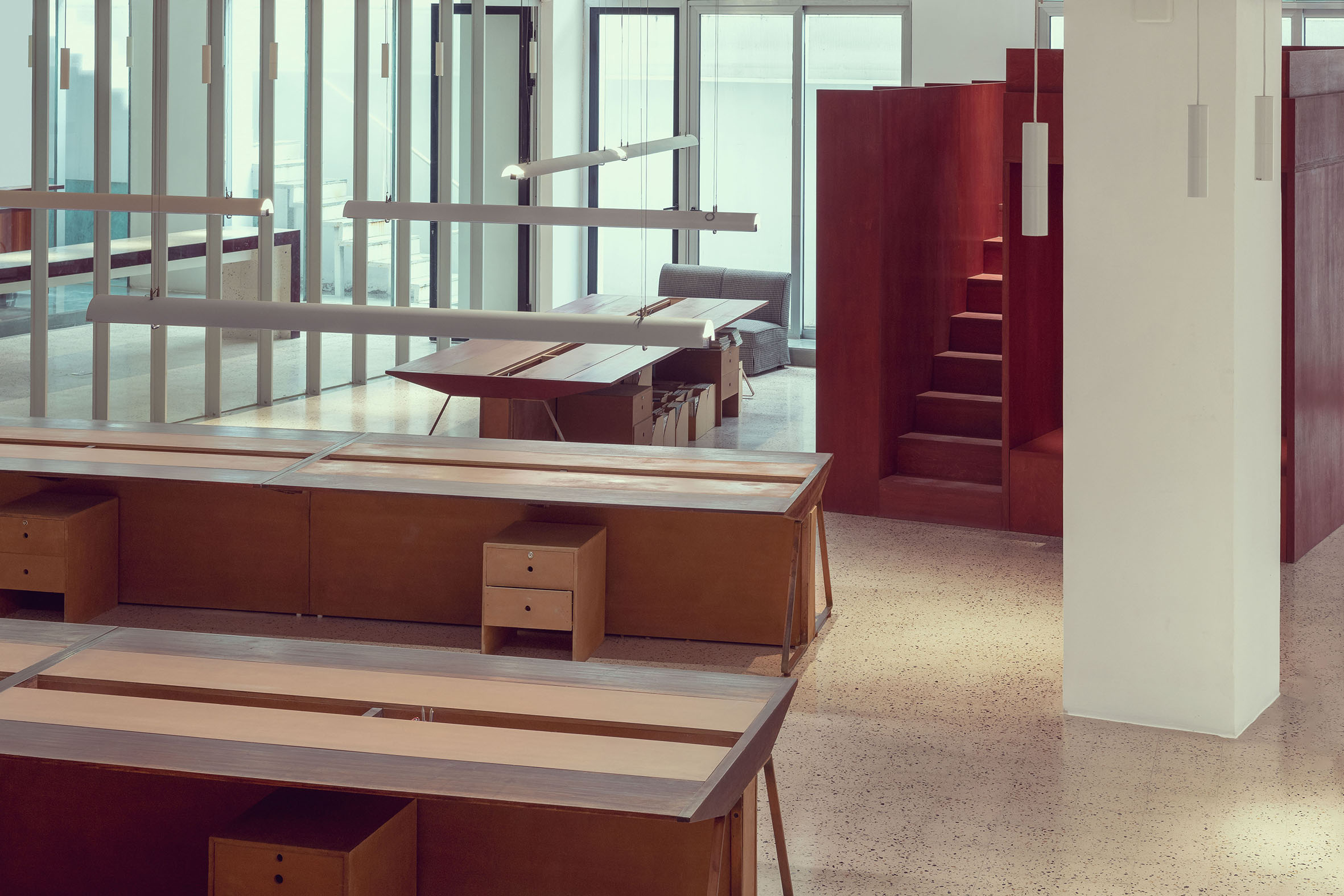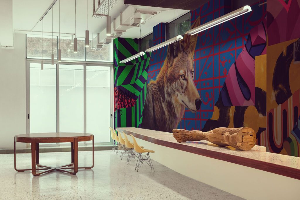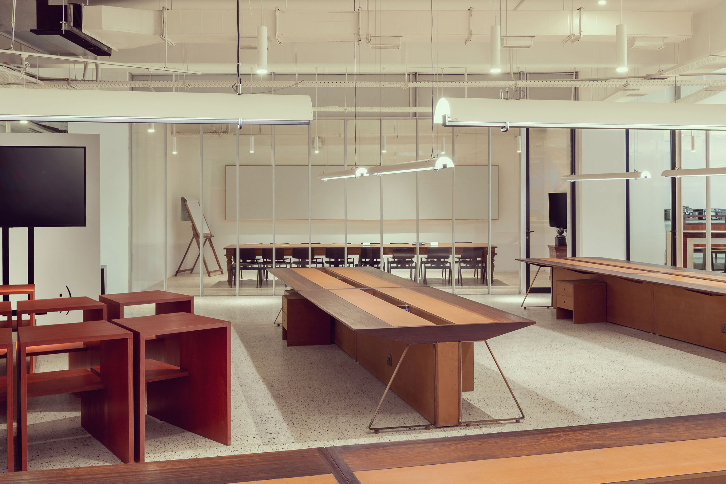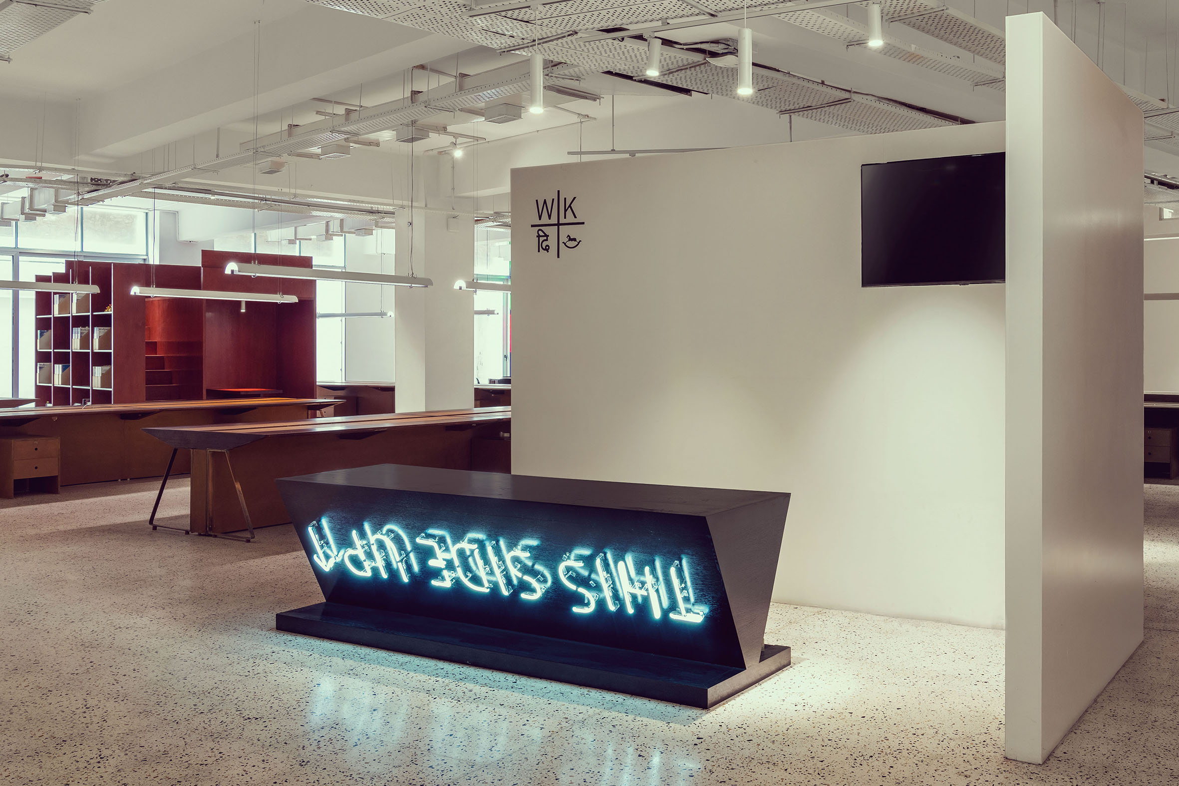 Here, the Studio was commissioned to create an office for a client for the third time. The relationship between continuity and newness was the most important consideration. In creating this open office, the Studio was keen on showing continuity with the “old” space, where collapsing the divide between public and private spaces had been an important trope. From a design perspective, this was a rare opportunity to improve upon an original idea, and introduce “newness” with consciousness: many of the materials that belonged to the original office were seamlessly carried through to the new project, and at the same time, certain spaces, such as the office library, were improved upon. An element of fun was also carried through to the new design, especially evident in the use of artwork.